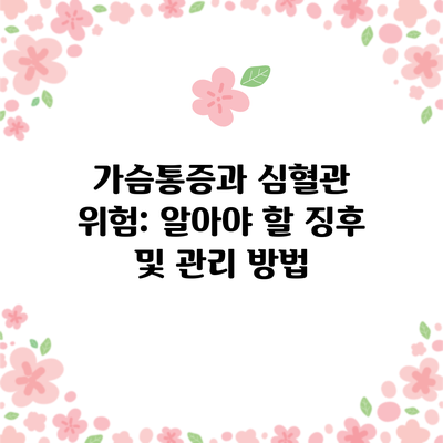 가슴통증은 심혈관 질환의 신호일 수 있어요. 가슴통증은 심혈관 위험의 주요 징후이므로, 조기에 발견하고 관리하는 것이 매우 중요합니다. 따라서 가슴통증이 느껴지면 즉시 의사를 찾아야 하며, 심혈관 질환 예방을 위해 건강한 생활습관을 유지하는 것이 필수적이에요. 여러분의 건강은 중요하며, 필요한 경우 전문가의 상담을 통해 더욱 안전한 생활을 이어가세요.